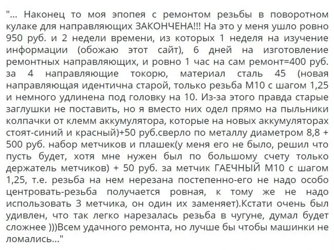 И еще вопрос, что можно сделать (как заколхозить) если на направляющей суппорта сорвана резьба в самом поворотном кулаке. Кто встречался с подобной проблемой пожалуйста поделитесь, как решали эту проблему. Менять весь кулак из-за этого вообще не хочется