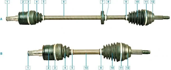 1 — стопорное кольцо внутреннего шарнира; 2 — корпус внутреннего ШРУС; 3 — большой хомут крепления грязезащитного чехла внутреннего шарнира; 4 — грязезащитный чехол внутреннего шарнира ШРУС; 5 — малый хомут крепления грязезащитного чехла внутреннего шарнира; 6 — вал привода правого колеса; 7 — демпфер; 8 — хомут крепления демпфера; 9 — малый хомут крепления грязезащитного чехла наружного шарнира; 10 — грязезащитный чехол наружного ШРУС Chevrolet Lanos; 11 — большой хомут крепления грязезащитного чехла наружного шарнира; 12 — корпус наружного шарнира; 13 — вал привода левого колеса