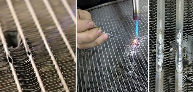 Если лопнула или пробита трубка (трубки) между бачками или между сотами, то они запаиваются, свариваются.