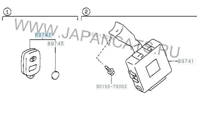 А на ключе нет кнопок? По вин номеру выдает несколько артикулов брелков, чистота не указано, выглядит вероятнее всего как на фото. У всех ниже указанных артикулов выдает замененный артикул Toyota 89742-12111. Попробуйте заказать брелок через менеджера магазина автозапчастей, во избежании ошибки при выборе.