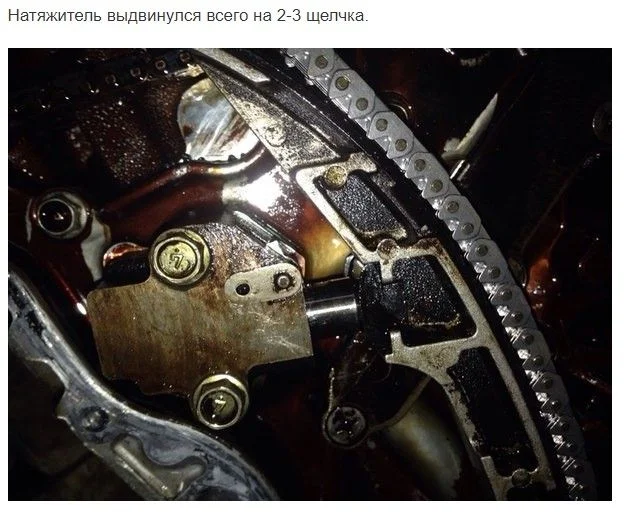 Судя по отзывам, если натяжитель выдвигается на 2 см и более, то шум цепи есть. На фото растнутая цепь, нижнее фото с новой цепью.
