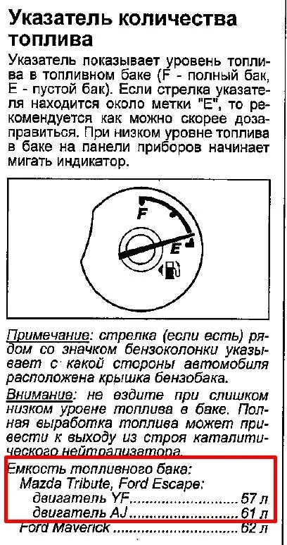 В одном источнике указано, что объем топливного бака 61 литр, в руководстве указано 61 или 57, в зависимости от двигателя. Скорее всего у всех 61 литр.