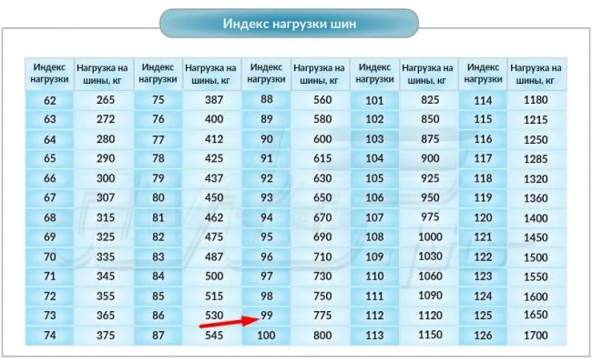 Индекс нагрузки 99 — это 775 кг (нагрузка на шины).