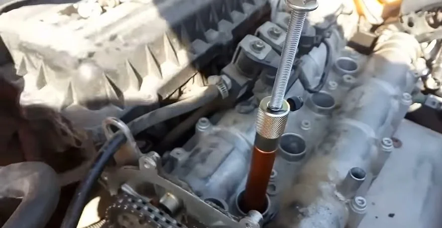 Чтобы выставить коленвал в ВМТ, необходимо извлечь свечку первого цилиндра и установить туда микрометр. Затем вращать коленчатый вал до нужных показаний микрометра.