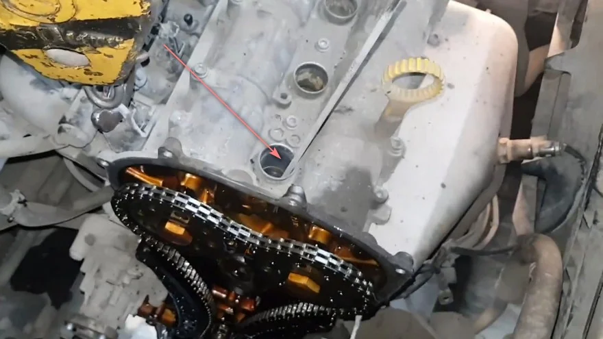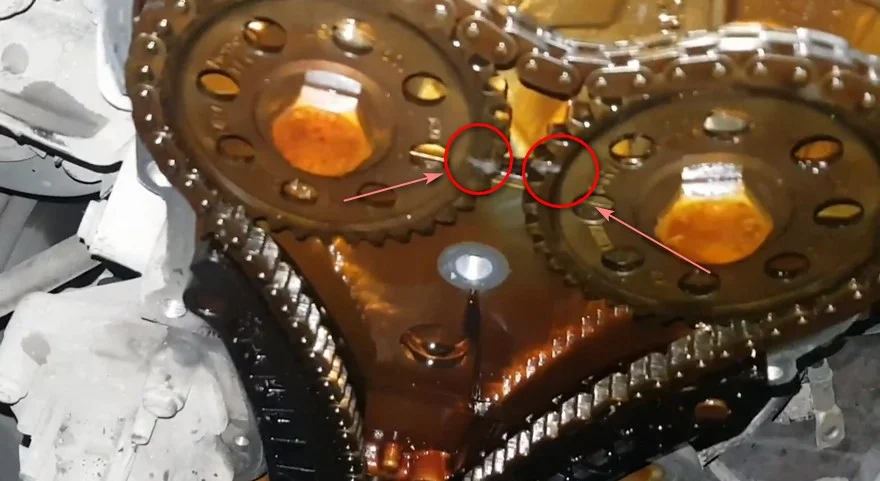 После установки ВМТ, с обратной стороны устанавливается кондуктор для фиксации распредвалов, и тогда уже можно снимать для замены цепь и шестерни.