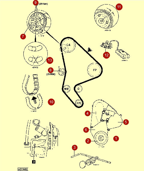 Надеть ремень на зубья звездочки распредвала. Слегка повернуть звездочку против часовой, чтобы зубья ремня вошли в зацепление. При этом угловое перемещение звездочки не должно быть больше одного зуба (11).