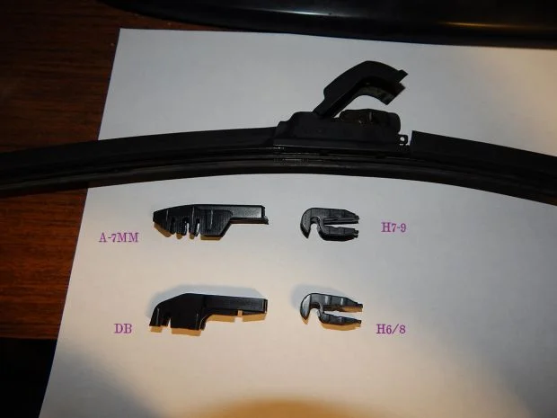 Добрый день! Не могу разобраться с пластиковым адаптором щетки стеклоочистителя. Купил щетку каркасную, пр-во «Хорс-силикон», к ней в комплекте четыре пластмассовых штуковины: две побольше с маркировкой DB и A-7MM, две поменьше H7/9 и H6/8.