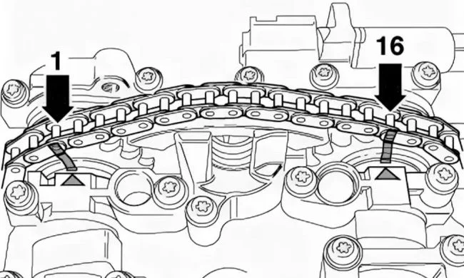 На цепи ГРМ и цепи балансиров есть цветные звенья, которые соответствуют меткам на шестеренках КВ и балансирных валов.