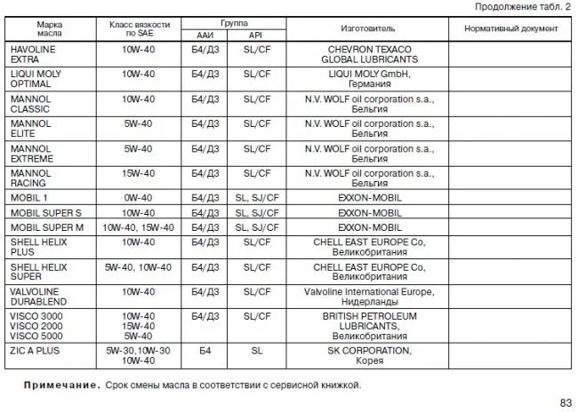 Залить можно практическое любое масло классификации API SG или выше, например Мобил, Ликви Моли. Ниже указана выдержка из руководства. Для замены требуется примерно 3,5 литра масла с учетом замены фильтра.