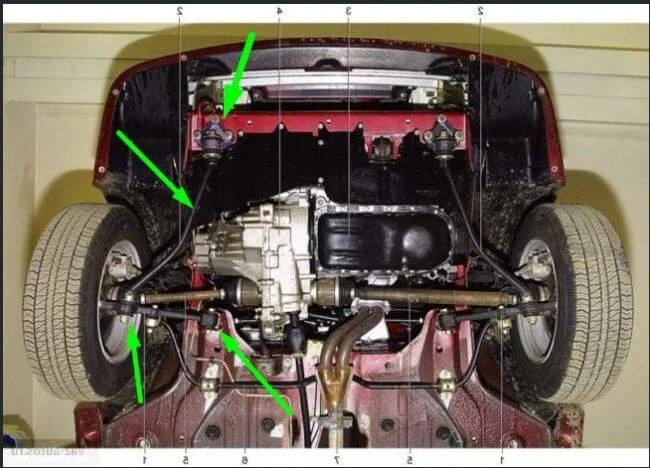 Нужно с ямы или на подъемнике смотреть, в первую очередь смотреть на растяжку рычага подвески и ее крепления к кузову (ее вероятнее всего погнуло и могло вырвать). На схемах казал места которые нужно в первую очередь смотреть. Амортизатор нужно снять и проверить не погнуло ли его.