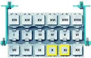 В этом блоке за включение вентилятора отвечают реле №10 и №11 (отметил их жёлтым цветом)
