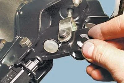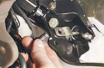 Отсоединив стопорное кольцо, извлеките палец, соединяющий педаль с вилкой толкателя главного цилиндра привода выключения сцепления.