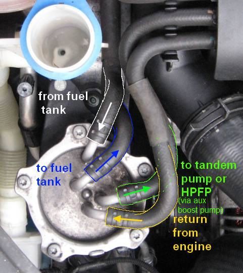 Рекомендую сравнить с фото ниже, и как у вас соединены шланги топливного фильтра. Тем более меняли мотор, могли напутать.