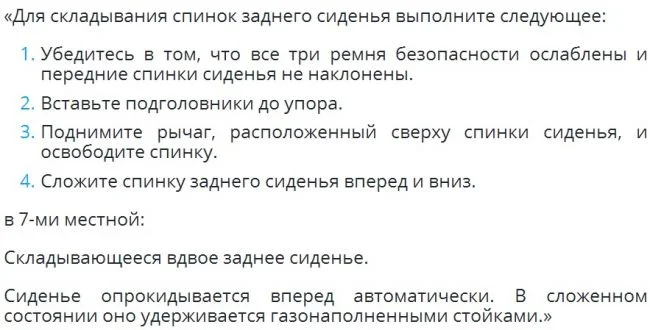 Ну и от себя немного: если при поднятии рычага спинка не желает складываться, то удерживая рычаг одной рукой, другой немного пошевелите спинку назад-вперёд и даже влево-вправо (может там механизм застопорился, зацепился за что-то, ну и помочь ему сработать).