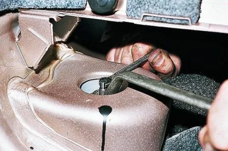 Когда авто поднят, снимаем колесо. Следующий шаг, это открутить гайку нижнего болта крепления амортизаторной стойки и выбить сам болт. Гайка там должна быть на 19, болт выбить можно молотком и вытолкнуть каким-нибудь ненужным другим болтом меньшего диаметра.