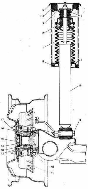 После того как пружина будет сжата стяжками, тогда можно открутить верхнюю гайку штока и стойку уже ничего не держит, она вытаскивается с автомобиля.