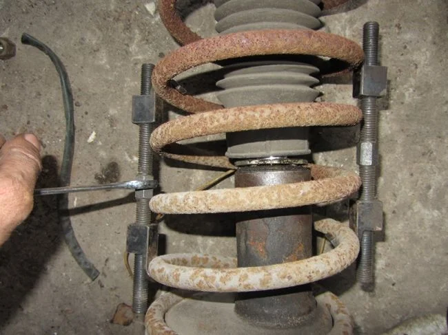 Из особенностей: понадобятся стяжки пружин (очень давно, когда впервые взялся самостоятельно снять пружину со стойки, я вместо стяжки использовал верёвку и металлическим прутком скручивал её — пружина сжималась. разобрать тогда у меня получилось, но я было не очень удобно это делать, и я понял, что надо купить стяжки, потом они меня выручали несколько раз — удобный инструмент в общем, эти стяжки пружин стоек амортизаторов и полезный).
