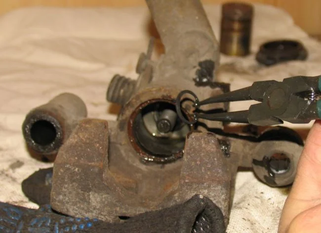Почитайте по ссылке https://www.drive2.ru/l/4082729/ нужно вкрутить винт в поршень, при этом выдавится внутренняя часть поршня.