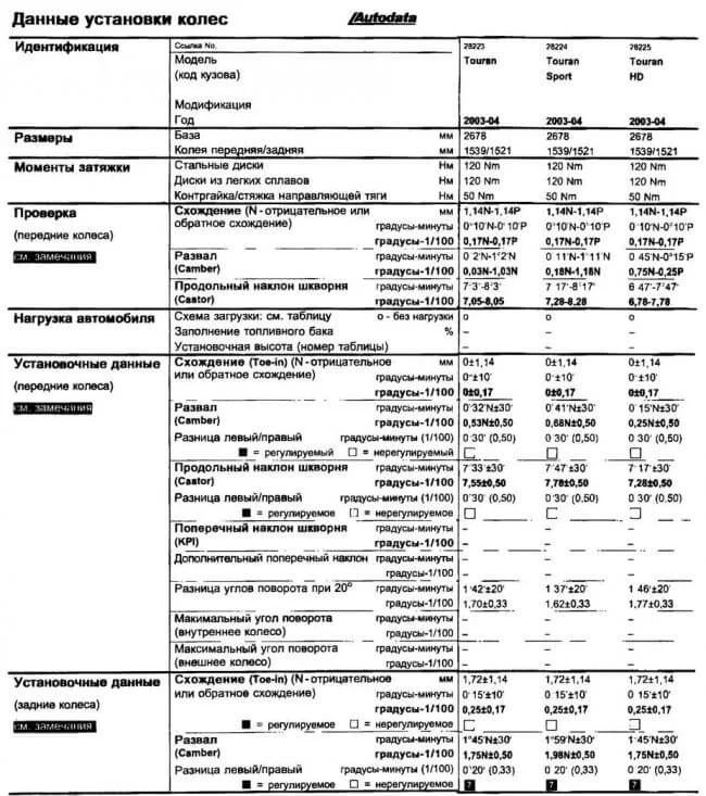 Как определить параметры развал-схождения для Фольксваген Туран?