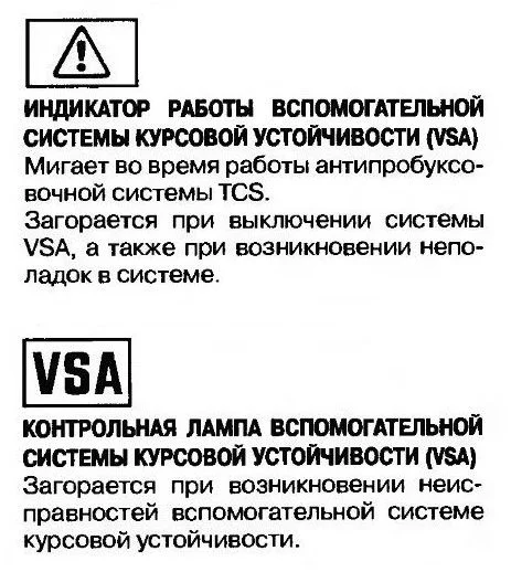 Если горит VSA, то это неисправность системы стабилизации, нужно провести диагностику сканером, считать ошибки и провести по ним проверки, проблема может быть например в датчике абс, в датчике положения руля, диагностика точнее подскажет.
