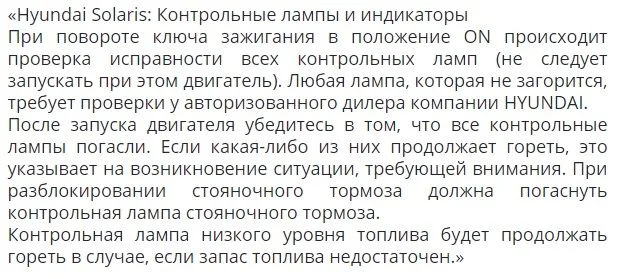На «Hyundai Solaris» появление всех значков на приборной панели бывает при включении зажигания (положение ON), пока мотор не запущен.