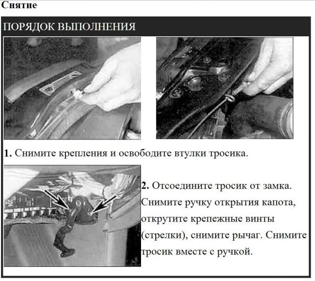 Здравствуйте. Прикладываю выдержку из руководства по ремонту, по замене троса капота (более крупно можете посмотреть тут).