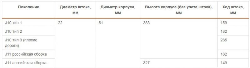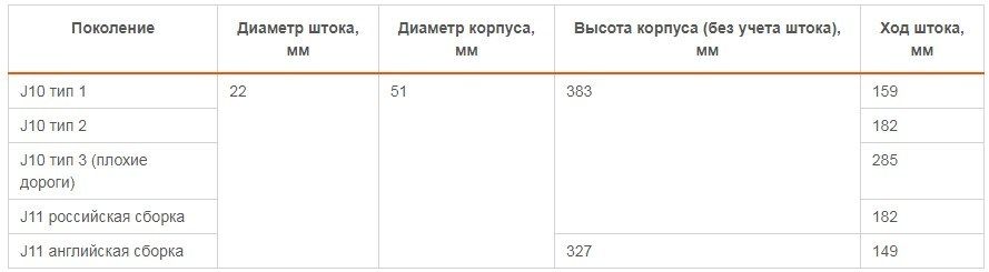 Выходит, что - подойдут амортизаторы от J10 для Вашей машины или нет, зависит от того, какая у Вас сборка - российская или английская. Как видно основное отличие - это ход штока. Если сборка российская то отлично подойдут амортизиторы 2 типа с ходом штока 182 мм. А в английской сборке и клиренс на 6 см. ниже, и ход штока меньше.