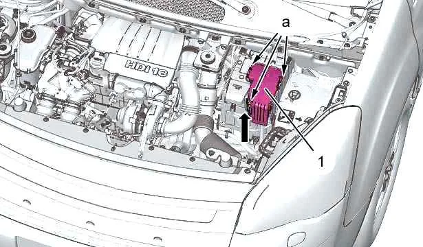 Освободить крышку блока предохранителей (1) (в зоне «a»), затем снять крышку блока предохранителей (1).