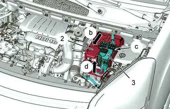 После чего освободить блок предохранителей (3) (в зоне «c»). Далее отодвинуть корпус предохранителей (3) АКБ (как показано «d»). Чтобы снять защитную крышку аккумулятора (2) нужно потянуть на себя (как показано «b»).