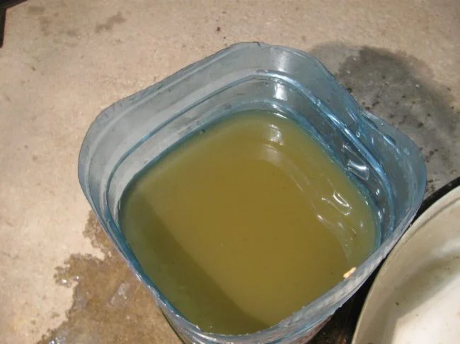 Потом сливаем старую ОЖ. Обычно она грязная, и с примесями ржавчины.