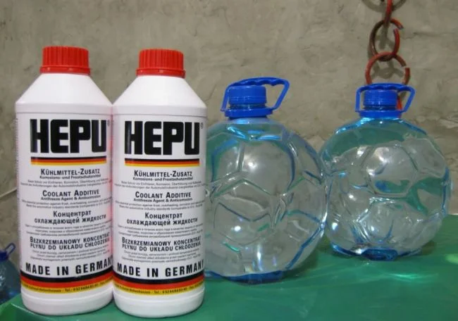 После вышеупомянутых манипуляций уже нужно залить охлаждающую жидкость. Заправочный объем на этом авто составляет порядка 5.3 литров, с учетом расширительного бачка. Для этого можно использовать HEPU G12. На фото ниже — концентрат этой ОЖ.