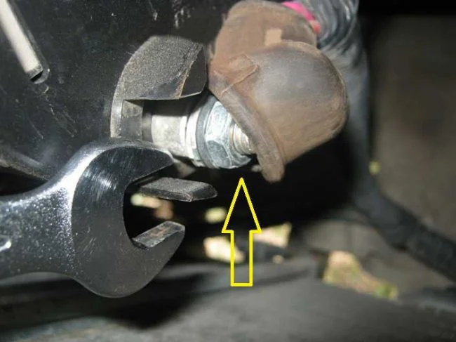 Провода прикручены двумя болтами (до верхнего достать не сложно, а второй снизу с ямы головкой и ключом на «13», как раз для этого и нужно было снимать бачок).