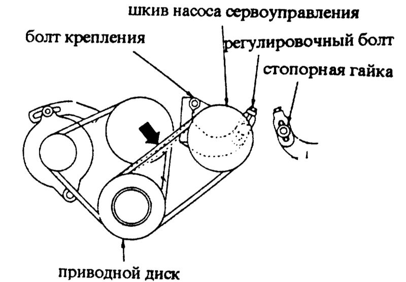 -Повернуть регулировочный болт, чтобы можно было снять клиновой ремень. Снять клиновой ремень.