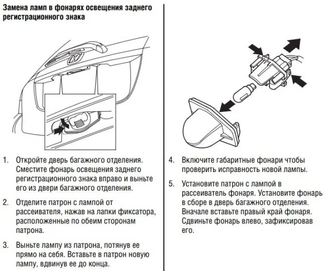 Вот выдержка из руководства, как заменить лампы подсветки номера, не снимая обшивку багажника, это делать нужно при плюсовой температуре и да, как заметил Анатолий, есть риск сломать защелки, так как пластик со временем становится хрупким.