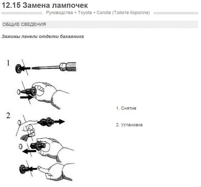 Королла 120, 2005 года, седан, 1,6. Не могу вытащить ни одного патрона с лампами из задних фонарей, шевелятся, но не поворачиваются. Боюсь сломать гнездо, центральный стопарь с трудом, но вытащил.