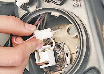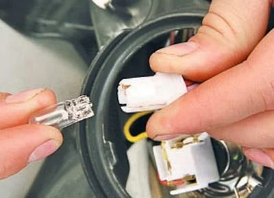 Поверните крышку фары лампы головного света против часовой стрелки и снимите крышку. Вытяните патрон лампы габаритного огня из гнезда(патрон установлен с небольшим натягом) и извлеките его из блок-фары.