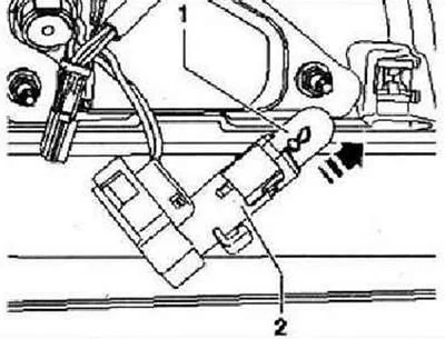 Извлечь лампу заднего фонаря -1- в -направлении стрелки- из патрона -2-. Лампа заднего фонаря: 12 В, 5 Вт.