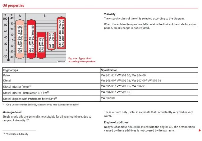 Производитель рекомендует заливать моторное масло допуска VW 501 01/ VW 502 00/ VW 504 00, вязкость можно выбрать 5W-30, для замены нужно примерно 4,6 литра масла с учетом замены фильтра. Масло лучше менять каждые 10 000 км пробега (или 1 раз в год, что наступит раньше), это продлит срок службы автомобиля.