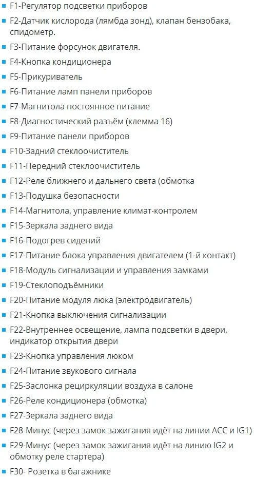 «Chery Tiggo» Предохранители (за маленьким бардачком в районе левого колена водителя):