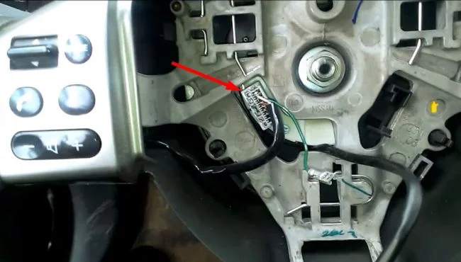 Снимите подушку безопасности с руля и проверьте, есть ли за ней разъем для кнопок, указанный стрелкой на фото. Как снять подушку безопасности показано на видео тут. Если разъем есть, то можно установить отдельно кнопки на руль, но при этом может потребоваться замены магнитолы. Про установку кнопок есть информация тут и тут.