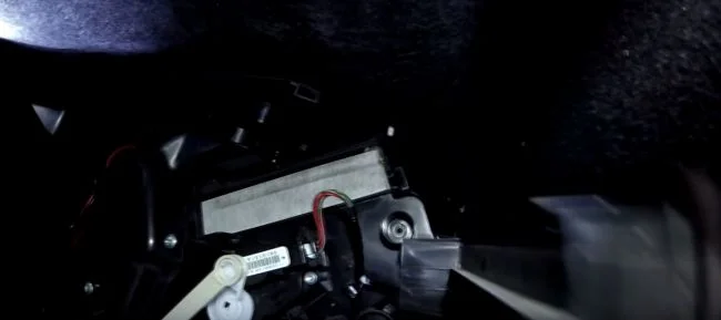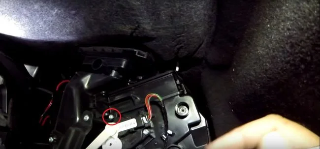 Открываем крышку, за которой находиться салонный фильтр. Для этого шестигранником на 3 откручиваем болт, отмеченный на фото. На не российских сборках авто этот болт отсутствует, а крышка держится только на защелке.