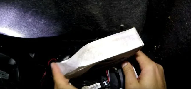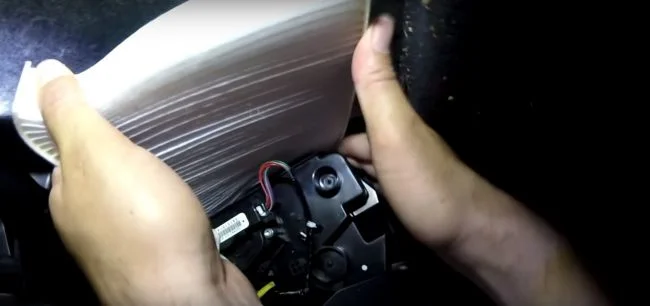 Вытаскиваем старый фильтр салона. Для этого его придется немного сжимать.