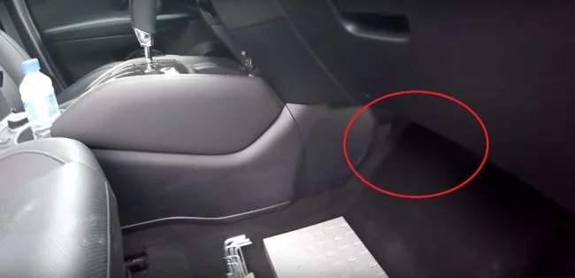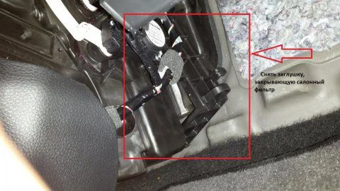 На фото ниже общий вид на центральную консоль со стороны пассажира. Салонник расположен в углу, под бардачком (на фото выделено красным цветом). Для снятия/установки лучше использовать фонарик.