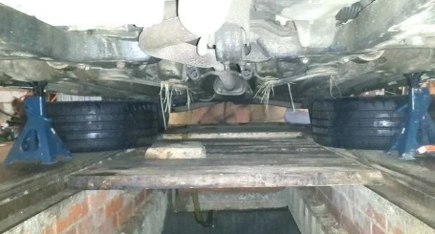 С подвески, придется откручивать от ступиц привода, также верхнее крепление стойки стабилизаторов, рулевые наконечники, шаровые опоры и всё это демонтируется дабы вынуть приводные валы из КПП и снять подрамник (хотя можно и не снимать его полностью, а только открутить его с одной стороны и приспустить со стороны коробки). Также под низом откручивать нижние подушки коробки передач, освободить подрамник от проводов, чтобы не порвались при его опускании. Откручиваем по периметру коробки все болты.
