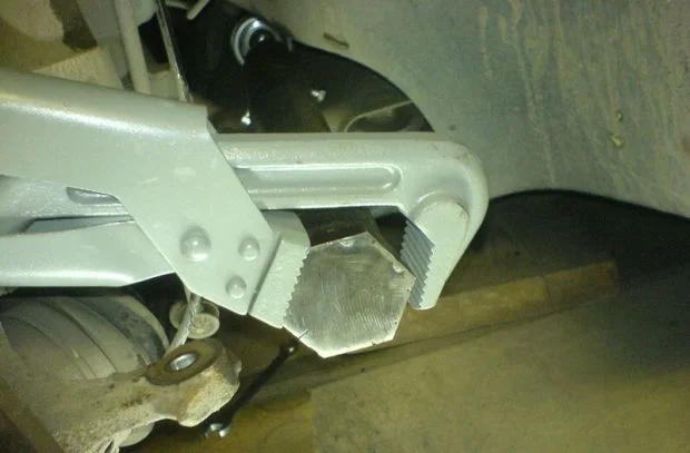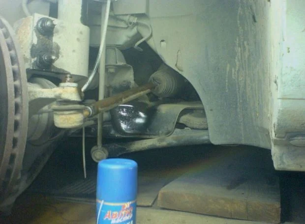 Открутив наконечник от поворотного кулака и самой тяги а также сняв пыльник — одеваем «чудо-съемник». Длина трубы должна составлять не менее 50 см. Т.к. если меньше, то при откручивании будет мешать ступица.