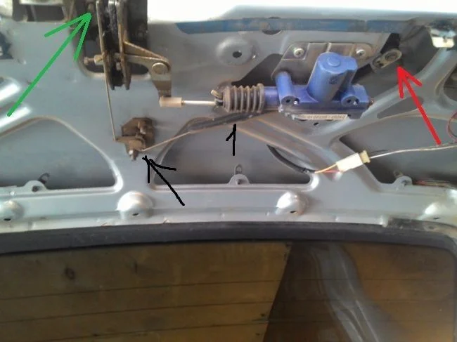 Там нет крепления что я указал на вашем фото под черной стрелкой, вот видно торчат два болта, на которых как я понял крепится, эта запчасть что под стрелкой черной, и к которой идут тяги от замка и личинки. Как то так.