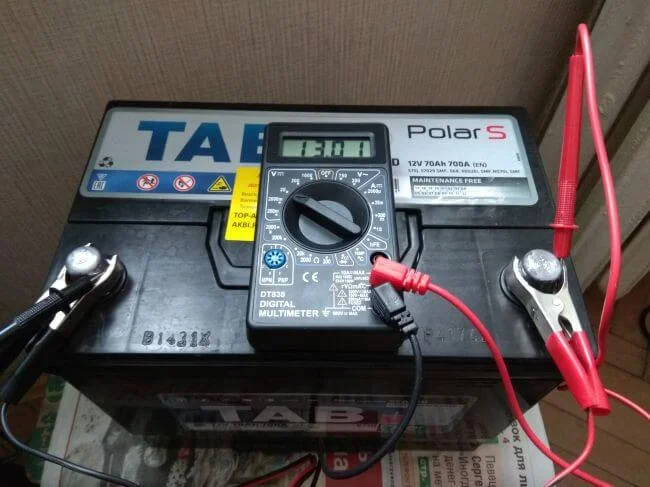 Последние 4 часа зарядки мультиметр показывал 14.7 вольт. «Кулончик» при этом весело светил зеленым индикатором зарядки. Ток при этом составлял 0.3 А. Без нагрузки АКБ показывала 13.01 В: