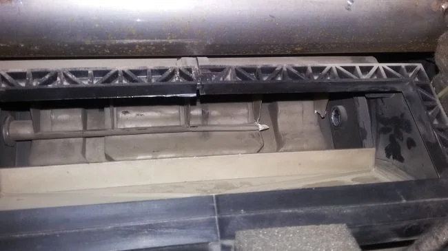 Вал обломан, кусочка не хватает, находим его внизу где радиатор! Для этого достаточно открутить 2 самореза удерживающие распределитель потока воздуха в ноги, вынуть его и аккуратно отщелкнув защелки-оттягиваем поддон радиатора.