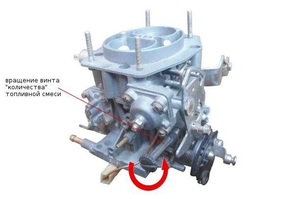 Винтом количества, если не убирается, тогда значит есть перелив топлива из поплавковой камеры, из-за того что повышен уровень топлива.