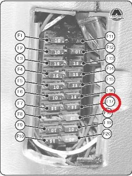 Предохранитель F17 в салонном блоке предохранителей(отмечено красным). Один из мануалов пишет «питание ЭБУ и топливного насоса от замка зажигания».